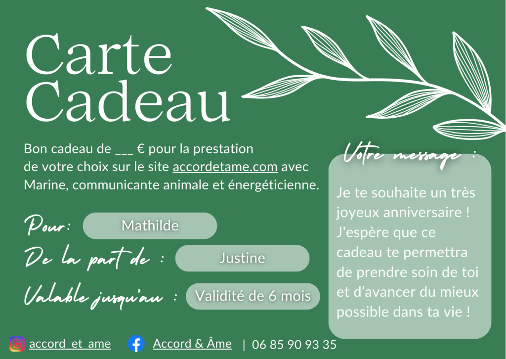 Nous le savons tous : le plus dur pour chacun est d’investir et de prendre du temps pour soi. Plus d’excuses pour vos proches à présent, offrez leurs ce temps pour eux et/ou pour leurs animaux. Avec cette carte, votre proche aura le choix du service : communication animale, accompagnement énergétique et/ou personnel, à distance ou à domicile.
