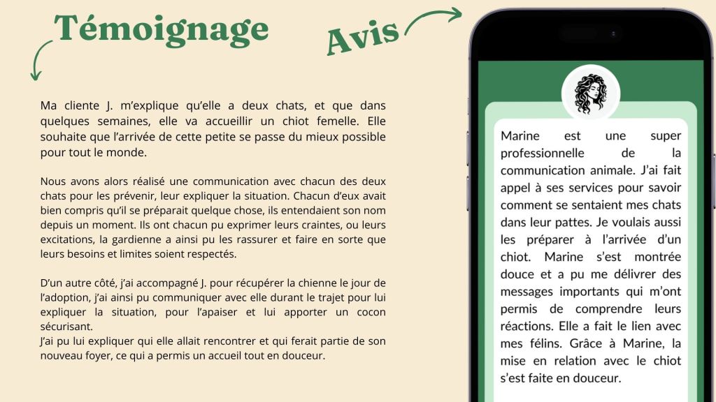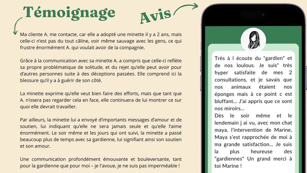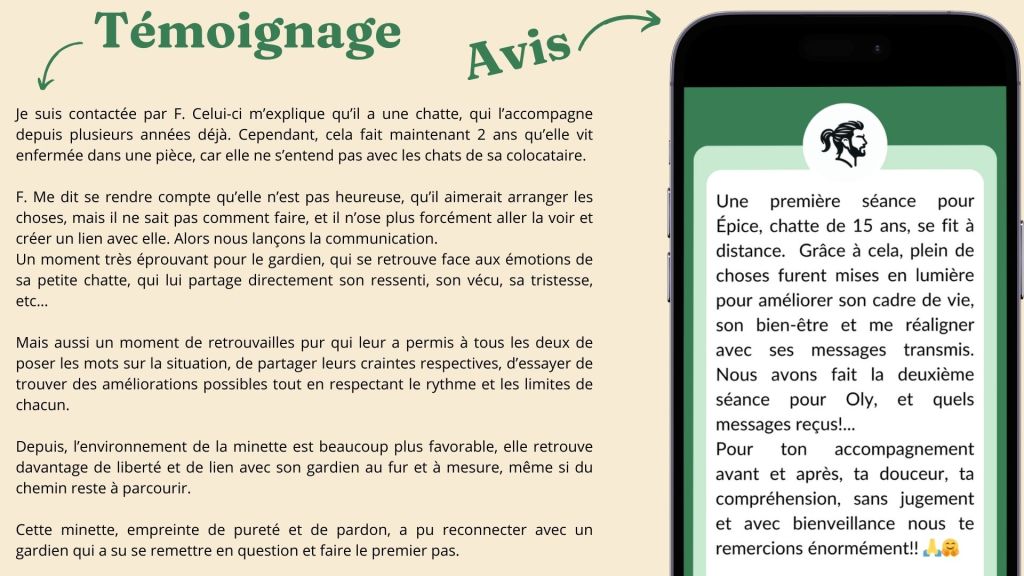 - Une fois la communication terminée, je coupe le lien avec l’animal et nous faisons un débrief ensemble, si vous le souhaitez.